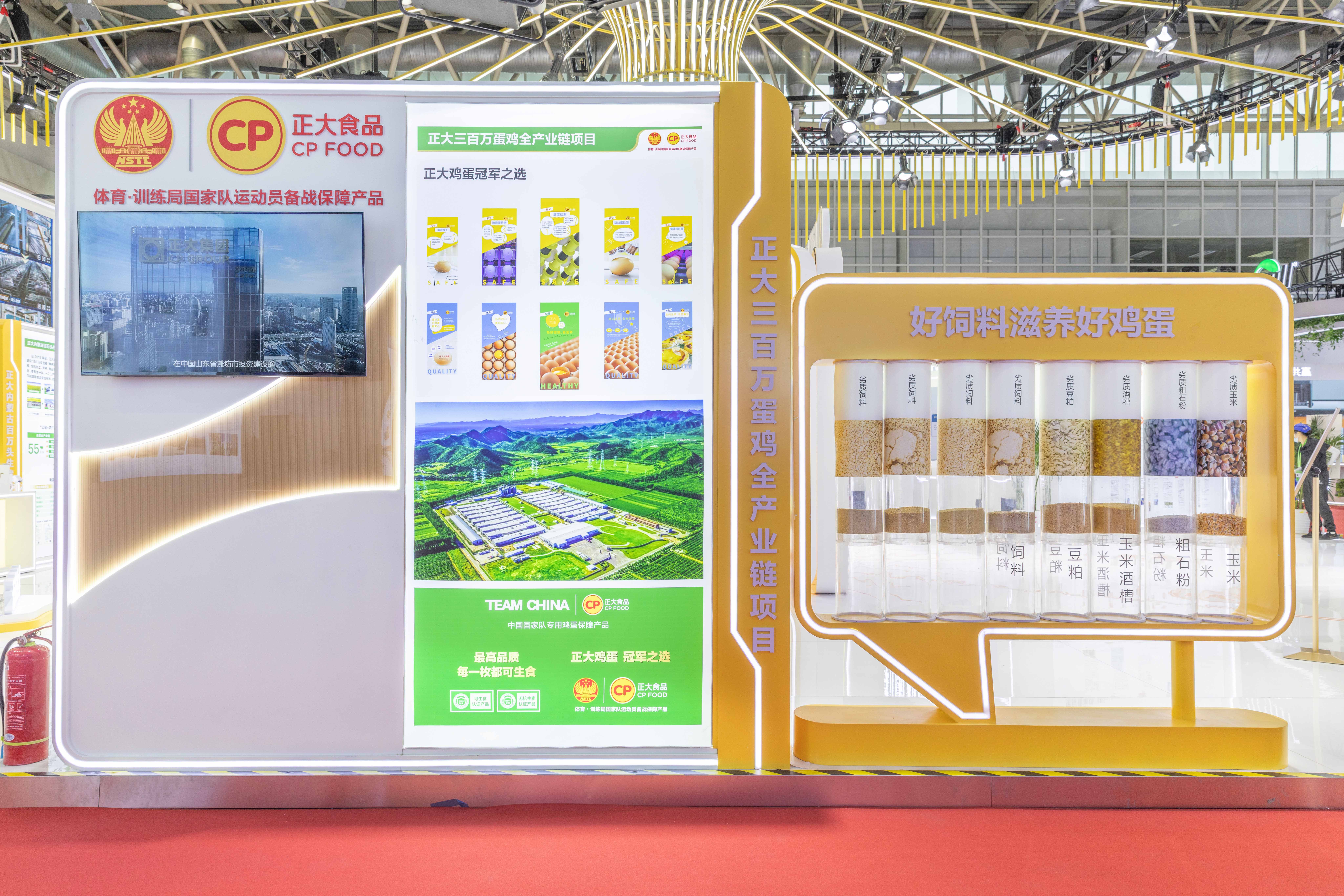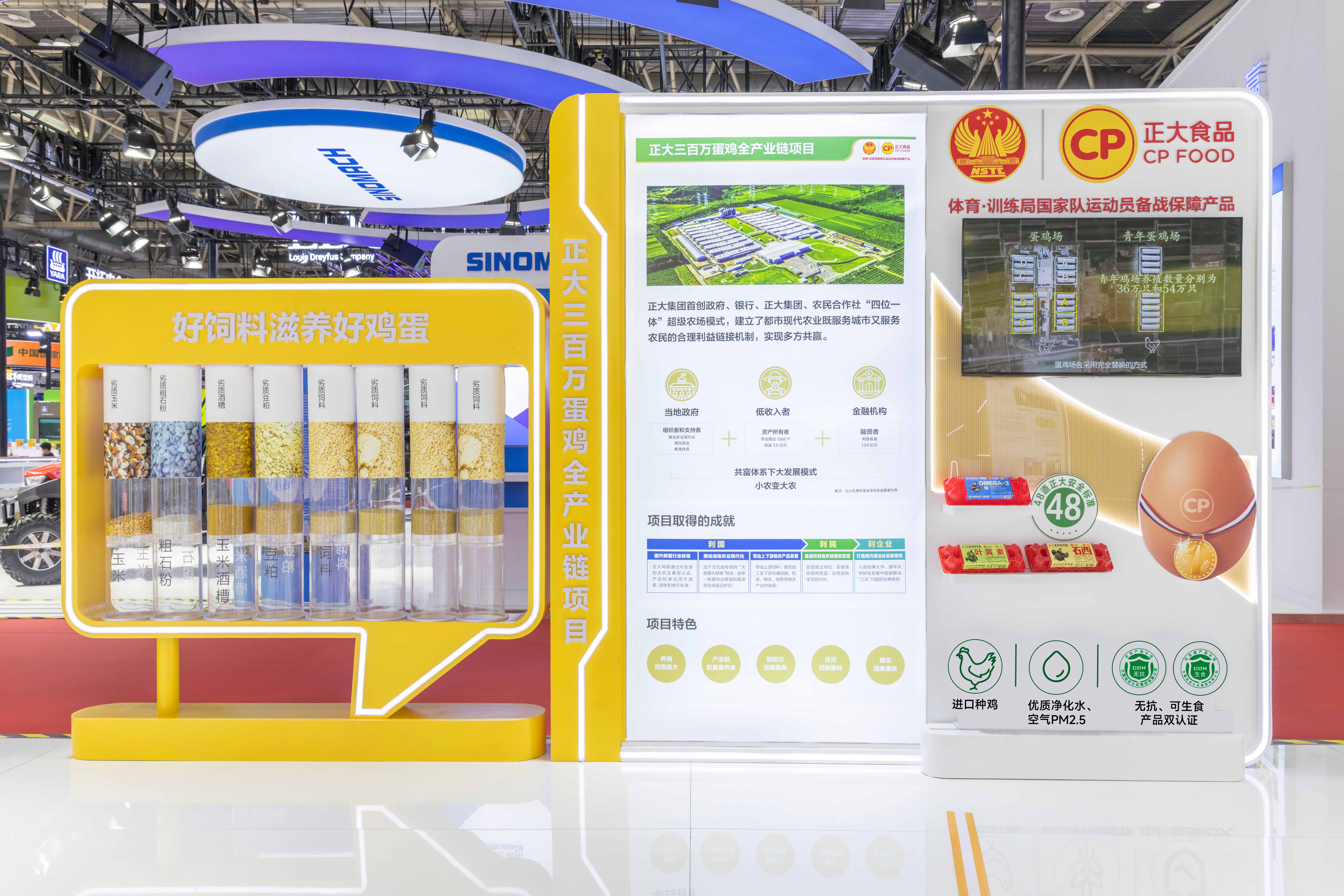 正大300萬蛋雞(ji)全產業鏈項目是集團(tuan)“四位一體”模(mo)式(shi)(shi)的(de)(de)典范。政府整(zheng)合資源、銀行提供(gong)資金支(zhi)持、農民(min)以土地入(ru)股獲得租(zu)金分紅(hong)與就業崗位、企業負責現代(dai)化運營管理,該模(mo)式(shi)(shi)成功重塑農業生產關(guan)系,實現“小農變(bian)大農”的(de)(de)共(gong)同富裕(yu)目標(biao)。現場(chang)還(huan)陳(chen)列了通過(guo)喂養OMEGA-3、葉黃素(su)、富硒(xi)等(deng)功能(neng)性(xing)飼(si)料生產的(de)(de)特色營養雞(ji)蛋,并利用VR技術播(bo)放雞(ji)蛋科普視(shi)頻,讓來訪嘉賓(bin)沉浸式(shi)(shi)學習雞(ji)蛋知識。