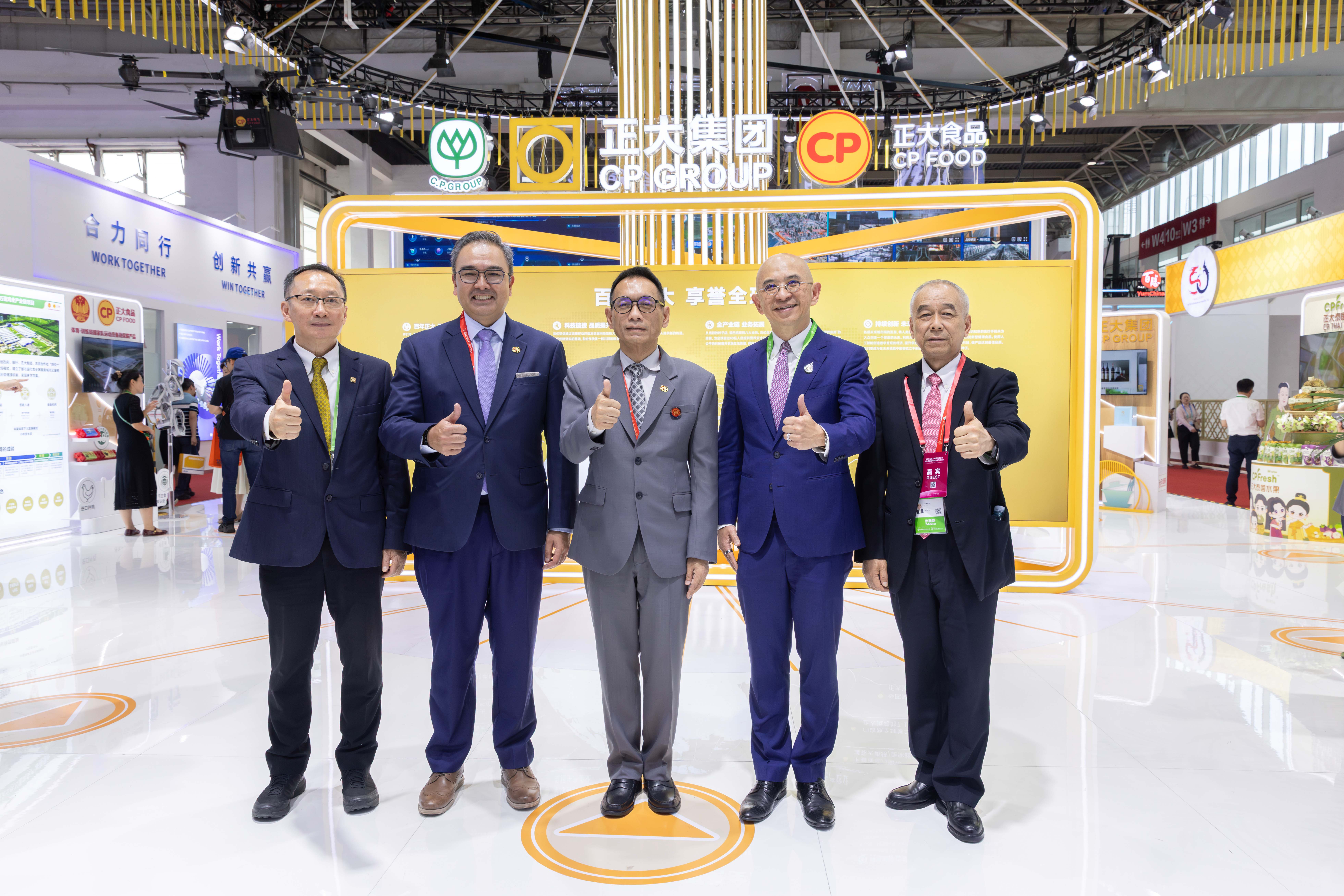 泰國(guo)商務(wu)部副(fu)次長(chang)艾卡(ka)闡·斯達(da)瓦(wa)拉瀾(中(zhong))一(yi)行(xing)參觀正大展館,正大集團(tuan)中(zhong)國(guo)區(qu)財務(wu)長(chang)楊森源(右二)熱情接待(dai)泰國(guo)政府(fu)來賓,集團(tuan)農牧食(shi)品企業中(zhong)國(guo)區(qu)資深(shen)副(fu)董事長(chang)薛增(zeng)一(yi)(右一(yi))、中(zhong)國(guo)區(qu)市場中(zhong)心資深(shen)總裁張曙(shu)暉(左一(yi))陪(pei)同接待(dai)并(bing)一(yi)同合(he)影留(liu)念。