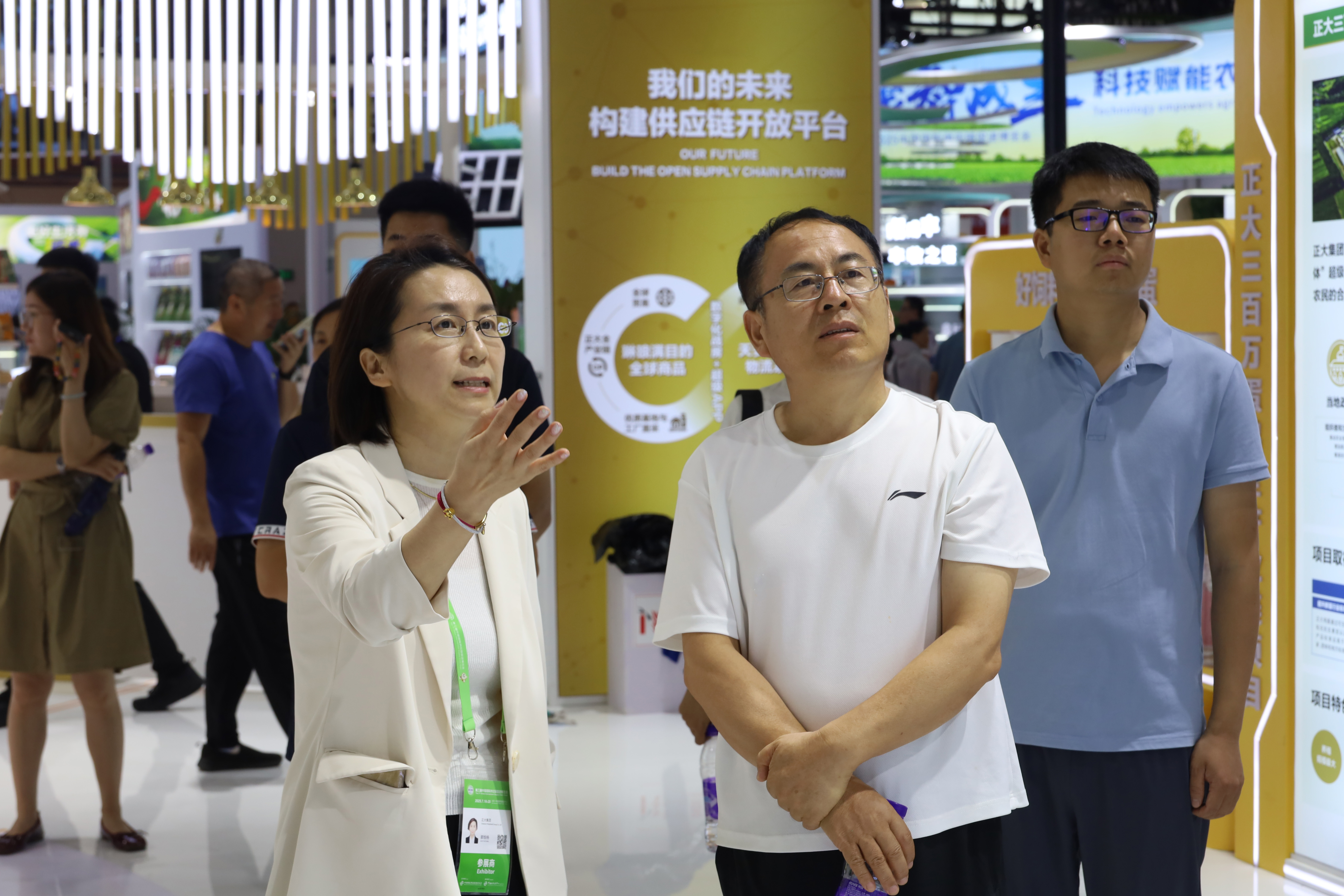包頭市(shi)(shi)招(zhao)商投資促進局(ju)副局(ju)長呂必(bi)成(中)一(yi)行參觀正(zheng)大(da)(da)展館,正(zheng)大(da)(da)集團農(nong)牧食品企業吉林省(sheng)區市(shi)(shi)場(chang)部經理(li)胡丞旿(右)熱(re)情(qing)接待(dai)來賓。