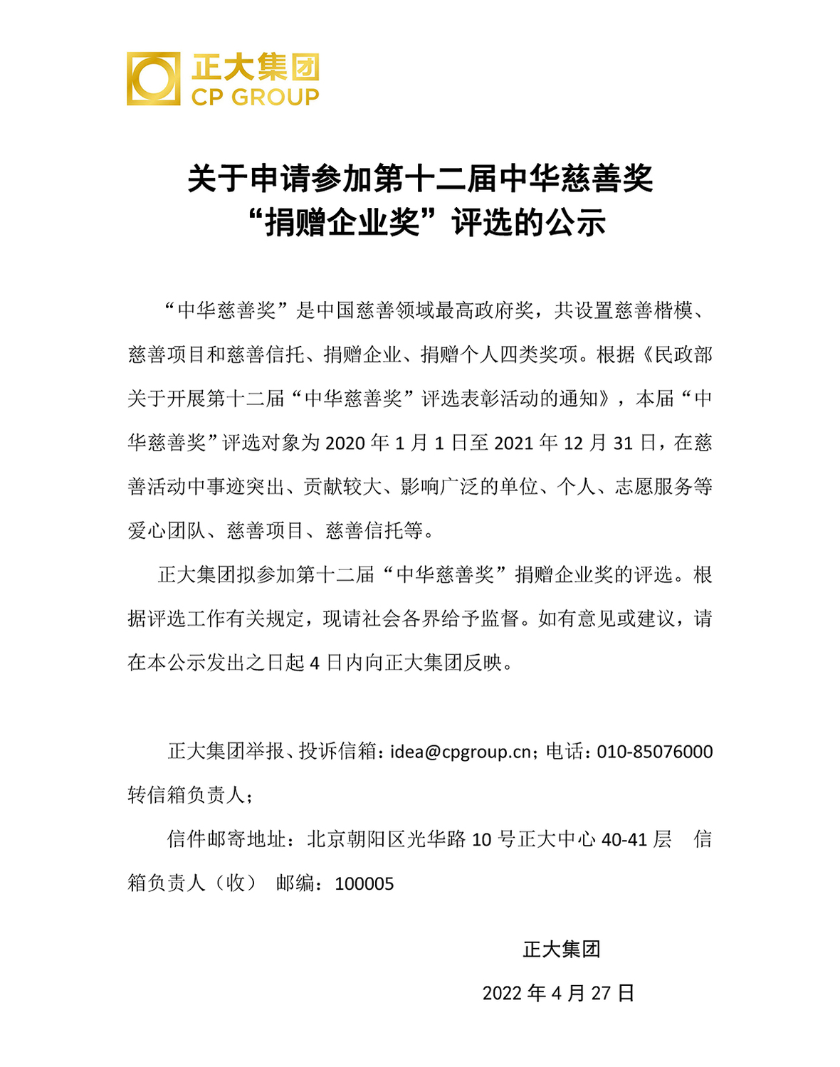 關于申請參(can)加第十二屆中(zhong)華慈善(shan)獎“捐贈企業獎”評(ping)選(xuan)的公示