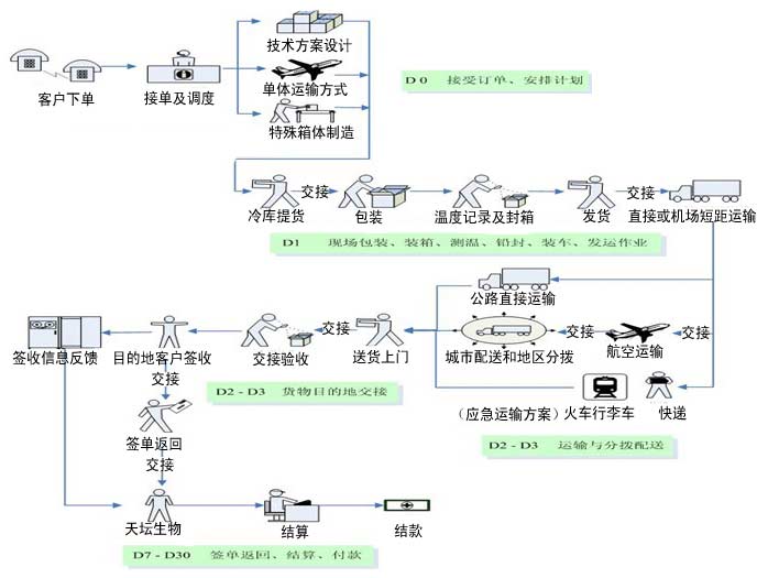 接到订单后(下单时间不超过下午15点,紧急订单截止到17点)将信息反馈给项目组,由运作人员协调承运商、安排运输计划、准备相关车辆或设施设备及单据、并预先制冷,如需特制设备的,公司组织安排生产;
